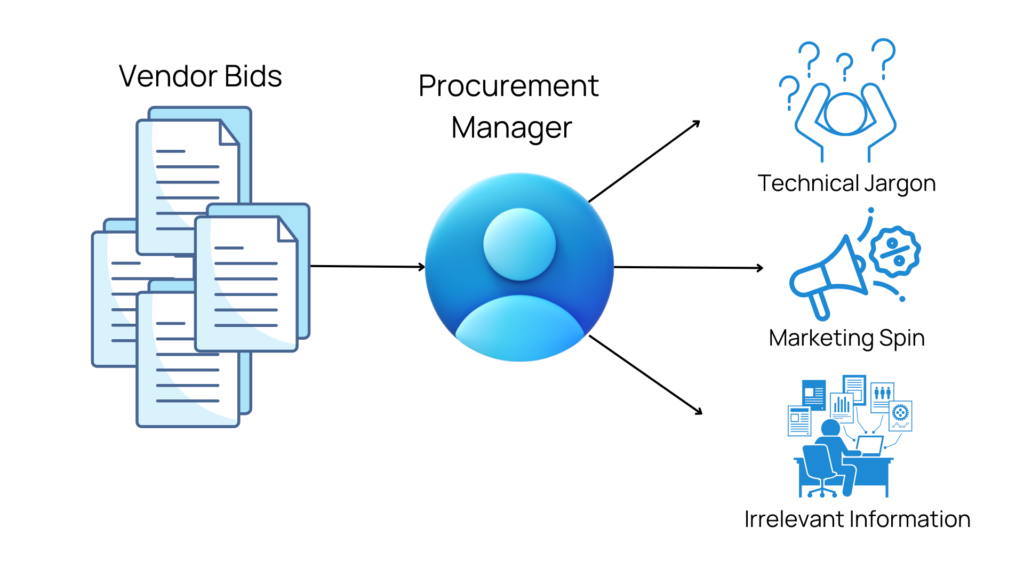 Procurement managers are often required to handle several bids for large-scale projects. The complexity of these bids is more overwhelming than the volume itself. Each vendor presents their offer differently, some in highly technical jargon, others with a marketing spin. Procurement teams sift through volumes of irrelevant information to find critical information.