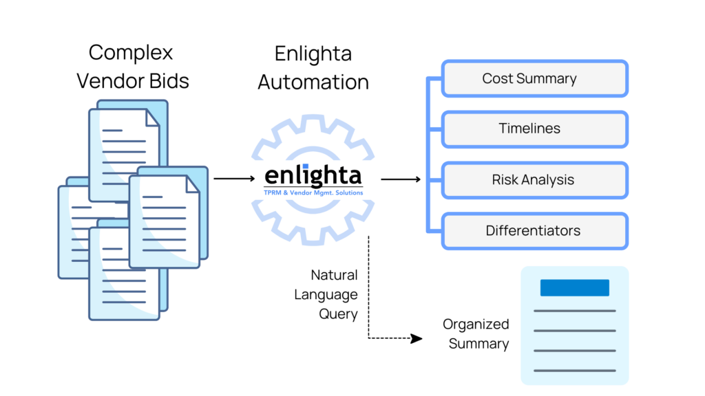 Automation can help them break down the bids into digestible summaries. Tools like Enlighta can validate and extract key information from bids, instantly highlighting crucial elements such as cost, delivery timelines, risks, and differentiators. Moreover, Enlighta AI Studio allows procurement teams to utilize its natural language ad-hoc query support where they can just ask a query about crucial information from a specific vendor bid and have quick and accurate responses.