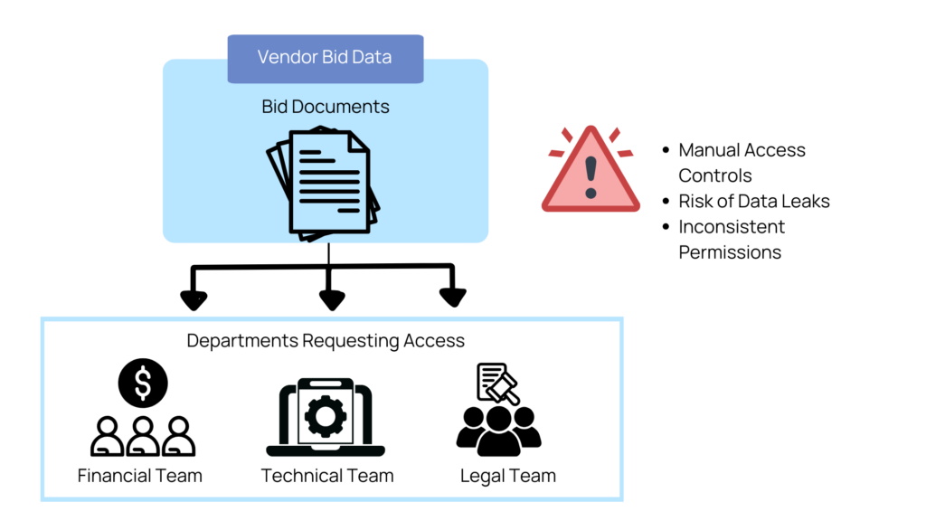 When evaluating a vendor bid, different departments need to have access to specific aspects of vendor provided information. For example, the finance team should only be able to access financial data submitted by the vendors, and the technical team should only be able to access the technical specifications of the vendor bid and the business requestor team would need access to the proposed commercials. However, managing access control manually is prone to errors.