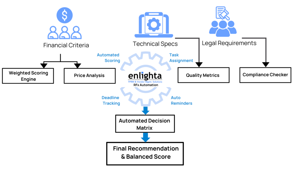 Procurement leaders need an automated evaluation tool like Enlighta’s RFx automation that provides a structured and data-driven approach to balancing competing priorities. Enlighta platform automates the vendor evaluation process through collaborative workflows. By assigning specific review and scoring tasks to different departments, along with automatic reminders and deadline tracking, Enlighta streamlines cross-functional collaboration.