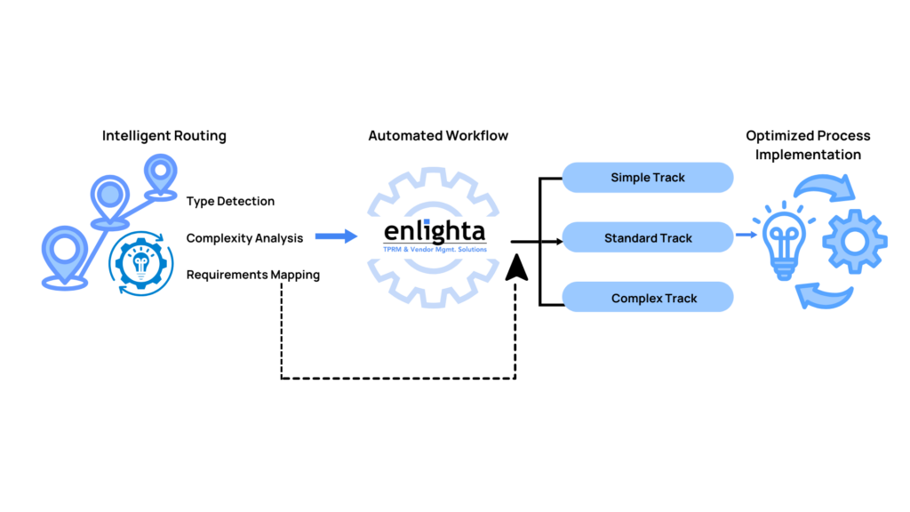 The platform adjusts to include additional stages such as technical evaluations, compliance verifications, and stakeholder reviews, tailoring the process according to the level of complexity.